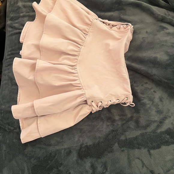 Chic pink skirt with lace-up sides and ruffled design. Perfect for a stylish look.