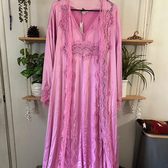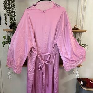 A vibrant pink,lace, silky robe. It is floor length and wide lower arm holes for extra elegance! Sooo cute and sooo sexy!!