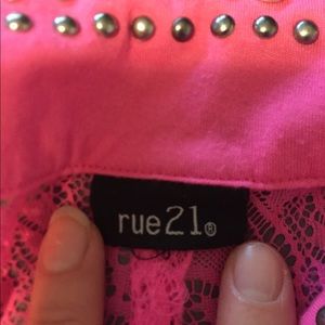 Pink button up tank with studded collar, lace front pocket, and the back is all lace