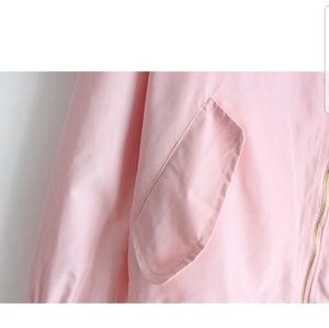 Adorable light-weight pink bomber jacket with side pockets and zips up. One size fits all. Patch on left sleeve.