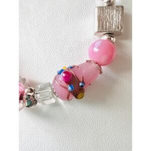 Handmade artisan bracelet with vibrant pink lampwork glass beads, crystal accents, and silver-tone spacers. Unique designs include raised dots, swirls, and foil-style details. Measures approximately 8 inches long with a toggle clasp closure.