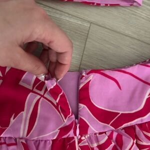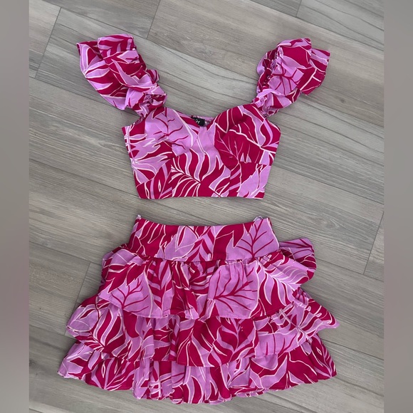 Embrace vibrant style with this pink leaf print two-piece set. Featuring a ruffle top and matching skirt, it's perfect for any occasion.