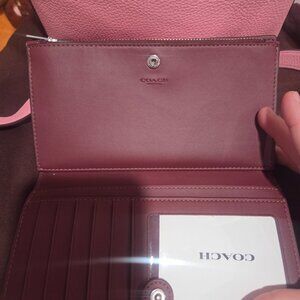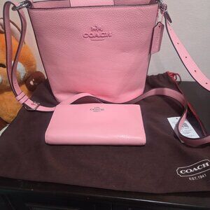 This is a never used pink leather coach bucket crossbody size is 6 in tall and about 7 in wide the wallet is 5.5 in tall and 3 in wide, there is room for multiple credit cards and ID and space for cash and coin in the wallet the bag itself has one zipper pocket and one regular pouch the strap is adjustable, comes with original dust bag