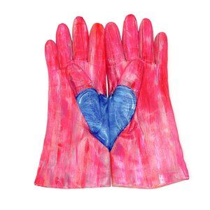 One half of a cool blue heart is painted on each glove. The halves meet as the hands come together to make one whole heart dripping with love, striking a captivating contrast against the bold hot pink background. These hand-painted up-cycled leather gloves not only shield you from the chill, but also serve as a visual reminder to stay bright and hopeful even when the world feels cold.