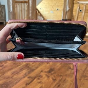Stylish pink leather phone wallet with a sleek design. Perfect for keeping your phone and essentials organized.