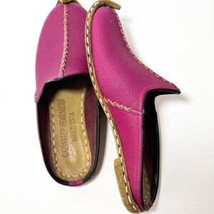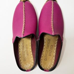 pink leather yemeni slippers. handcrafted in gaziantep turkey. best fit size 7.5 . I somehow bought a pair too small for me. incredible quality. I wear a 8-8.5 girl. lightly / barely worn as you can see from the condition. please measure your foot to fit. If it is around 9- 9.15" these should work for you.
