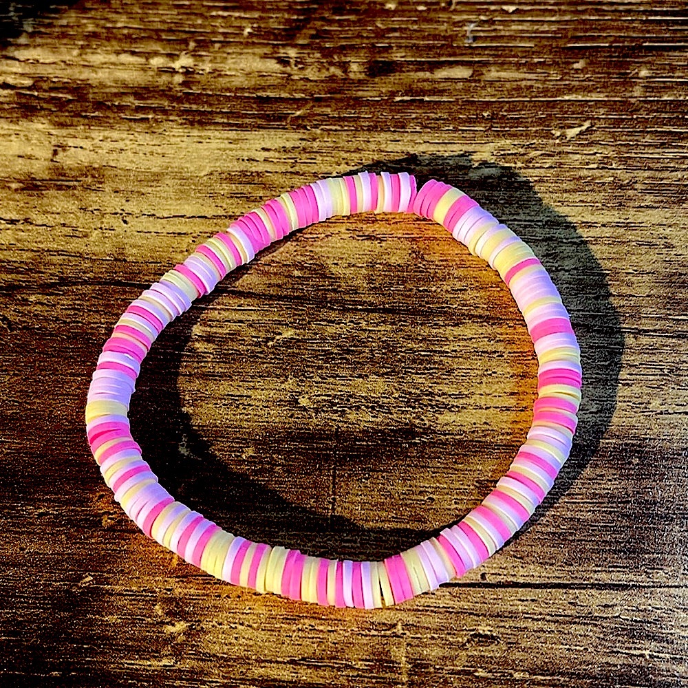 Stretch bracelet made of hot pink, light pink, and yellow clay beads.