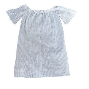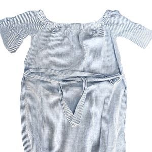 Off shoulder belted dress in a blue and white striped seersucker. Tie waist belt. Flutter half sleeves. Elastic around the shoulders.