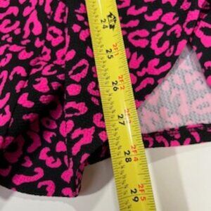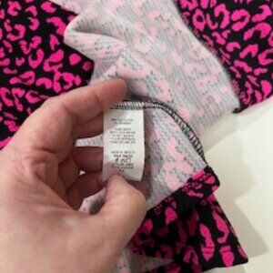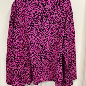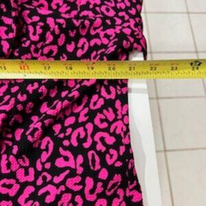 This super cute pink leopard cardigan was worn once. The size can been seen on the tag inside the jacket in one of the photos. It is a lightweight cardigan. See pictures for approximate size measurements. Super cute!