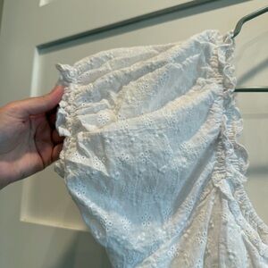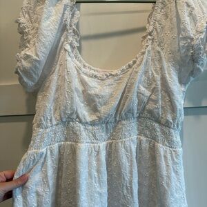 Charming white floral lace dress. Perfect for summer or spring. Pink Lily brand, cute white floral lace like design. 100% cotton shell, 100% vicose lining. Great condition, no noticeable flaws. Size 3Xl, super cute on. Puffy sleeves and ruffles throughout.