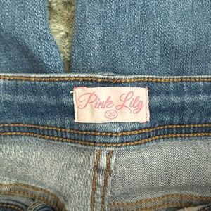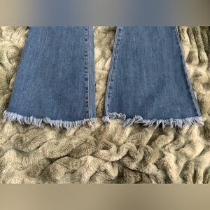 Stylish flare jeans. Classic blue denim. Frayed hem detail.