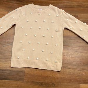 Chic blush sweater with playful pom-pom details. Crew neck design. Perfect for cozy days.