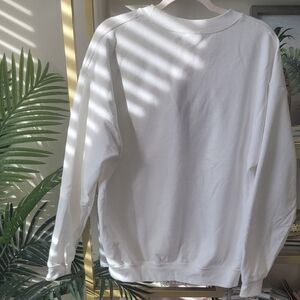 Pre-owned cozy white sweatshirt with a graphic featuring bold pink lettering. Great condition, barely worn. Long sleeves. Crewneck pullover. Perfect as casual lounge wear during winter, the holidays, and valentine's day. Cotton and polyester blend. Wear over your winter and valentine's or galentine's day pajamas.