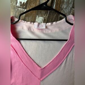 Cozy v neck knit top, color block of 2 shades of pink. Light, loose, little oversized boxed style. In excellent condition.