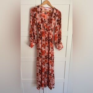 Pink Lily Dress Womens Faux Wrap Slit Maxi Long Sleeve 70s Retro Floral