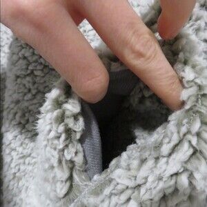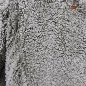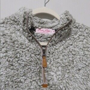 Warm, soft, and fuzzy Sherpa pull over by the boutique brand pink lily. It is a light heather gray color with cognac brown accents. Cozy and comfortable for hanging out as loungewear. Quarter zip style called the snowy dreams pullover. Long sleeves, lightly lined, faux fur. In good condition but there are some signs of wear on the inside. Perfect neutral color and style for Fall and Winter