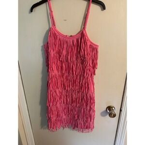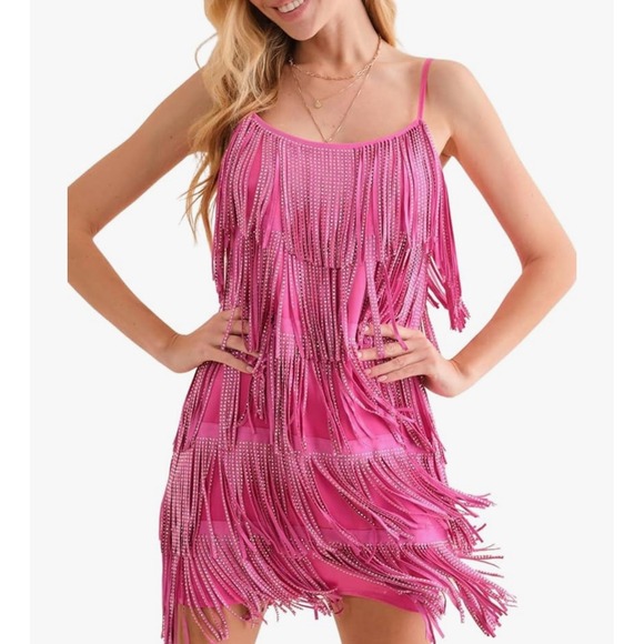 Keywords: pink fringe dress, sleeveless dress, party dress, cocktail dress, club dress, mini dress, women's dress, fringe detailing, summer dress, spaghetti strap dress, festival dress, flapper dress, vintage inspired, retro dress