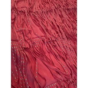 This charming mini dress features a sleeveless design with adjustable spaghetti straps and a playful fringe design that extends from the neckline to the hem in multiple tiers. The dress is fully lined, offering a comfortable fit, and it closes with a concealed zipper at the back. The fringe is adorned with tiny silver embellishments that catch the light, adding a touch of sparkle to the garment.