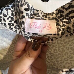 Trendy Pink Lily cropped jacket in a bold black-and-white leopard print. Made from sturdy denim material with a slightly distressed hem for a modern touch. Features front button closures, flap chest pockets, and long sleeves. Although tagged as a Small, this jacket fits more like a Medium/Large, giving you a comfortable and slightly oversized look.