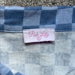 Chic light blue checkered jacket. Features button closure and stylish design.