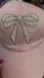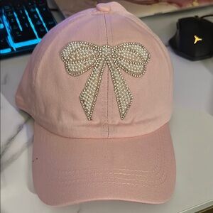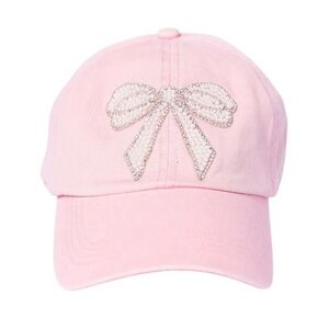 Stylish pink cap featuring a sparkling rhinestone bow design. Perfect for adding a touch of glam to any outfit.