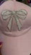 Stylish pink cap featuring a sparkling rhinestone bow design. Perfect for adding a touch of glam to any outfit.