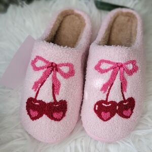 Brand new, never worn pink slippers featuring a trendy red cherry on top and a pink bow. Interior of shoes have a brown fur sole that is soft and comfortable! Still in their original packagBow. Very trendy and stylish!