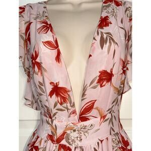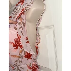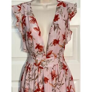 Pink with red floral print, deep v-neck, ruffle sleeveless top, tie waist, tiered ruffle bottom, side zip, lined