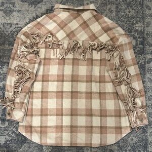 Cozy plaid teddy jacket. Features fringe details. Perfect for layering.
