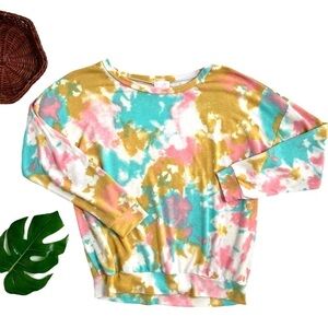 TITLE: Pink Lily Tie Dye Pink Blue Tan Pullover Jumper Crewneck Sweatshirt Size Small