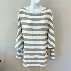Pink Lily grey and white stripe 3/4 bat wing sleeve soft stretchy top. Round neckline. 3/4 length sleeve. Batwing sleeve. Insanely soft and stretchy material. No size tag but fits like a size medium or a size small could wear for more oversized fit. See pictures for approximate measurements. Excellent condition. Super soft and cozy!
