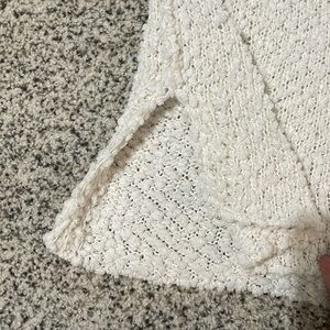 Pink Lily sweater the popcorn like material, its thin and somewhat see through as shown with my hand underneath. Little shorter in the front as shown as well.