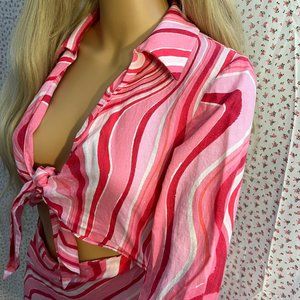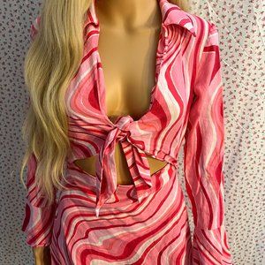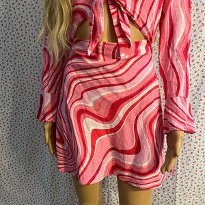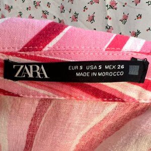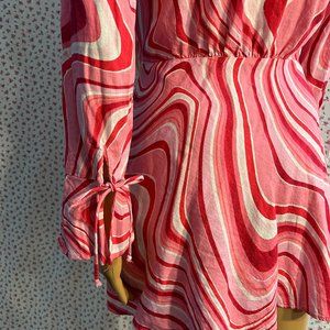 This dress is sooo a sweet psychedelic Elle Woods. A size small Zara dress perfect for spring. The dress has a zipper down the side, a mock tie in front, and a tie on each sleeve. True to size, mini length lands mid-high thigh depending on height.