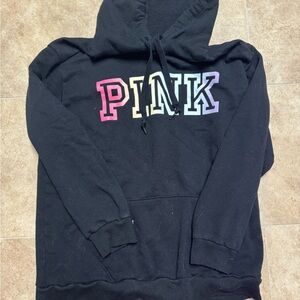 Set of two hoodies with bold 'PINK' logos. One is black with a multicolor logo. The other is pink with a black logo. These are relaxed fit. The pink one has a tiny stain above the logo see pic. Black one was worn once.