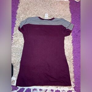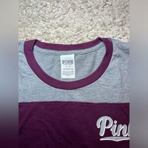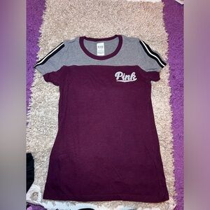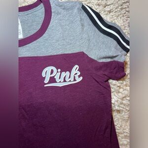 Stylish t-shirt featuring a 'Pink' logo. Gray and burgundy with black and white striped sleeves.