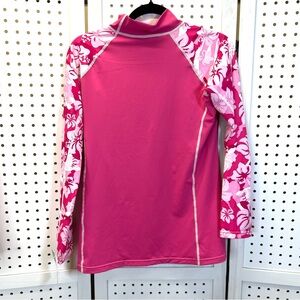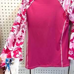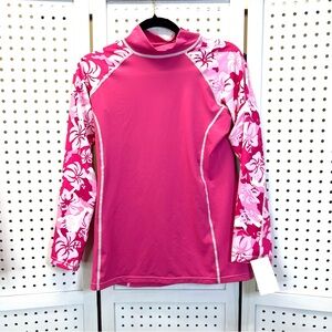 Bright pink long sleeve rash guard with white floral accents. UPF 50+ protection.