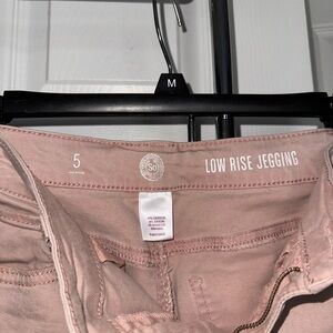 A pair of pink low-rise jeggings in size 5, designed for both comfort and a flattering fit. These jeggings are crafted from a soft, stretchy cotton blend that hugs the body while providing a comfortable, flexible feel. The vibrant pink color adds a fun, playful touch, making them perfect for casual, trendy looks. The low-rise waistband sits comfortably just below the hips, creating a sleek and modern silhouette. The jeggings feature a slim, body-hugging fit that tapers down to the ankle, showcasing a smooth, streamlined appearance. The fabric has just the right amount of stretch, ensuring ease of movement without compromising shape. Functional front and back pockets maintain a streamlined design, while the classic five-pocket styling adds a touch of denim-inspired flair. These pink jeggings pair effortlessly with a variety of tops, from casual tees to blouses or sweaters, making them a versatile addition to any wardrobe. Ideal for casual outings, a day of shopping, or a relaxed weekend look.