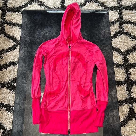 Pink lululemon jacket with hood and thumb holes.