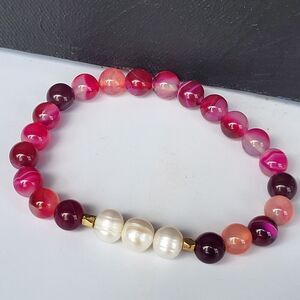 Pink Magenta Striped Agate Anxiety Calming Bracelet with Pearls 8"