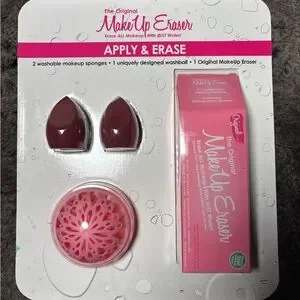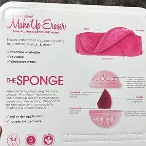 pink makeup remover set gently removes makeup with just water. Includes washable sponge inserts and a uniquely designed pink washball for easy application. Travel-friendly and reusable for daily use.