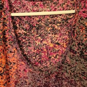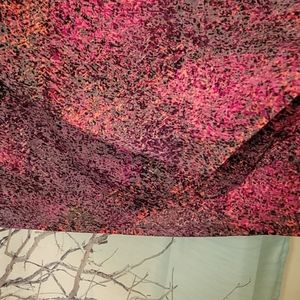 Soft material, layered look in front of top. Very pretty contrasting colors, flows to back of top as well. Not too light or heavy weight.