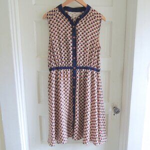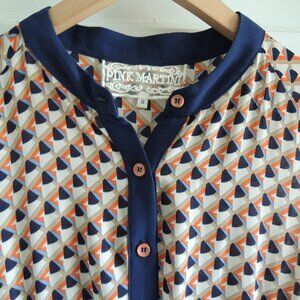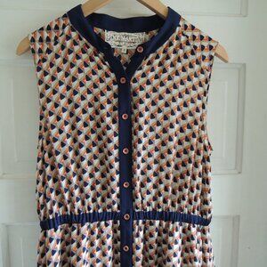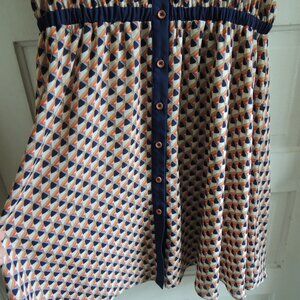 Pink Martini blue & orange geo print retro dress, size Small (runs large, please check measurements). Summery, flowy dress has a fit & flare silhouette and cream background with geo print in navy, light blue, orange & tan. Sleeveless (generous shoulder coverage) with a round neck, button front, and stretchy elastic waist. Navy accents at waist, collar and placket. Lower portion is lined. Whimsical and vibrant, with a retro vibe. EUC.