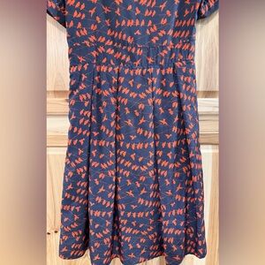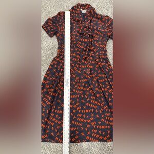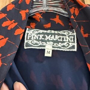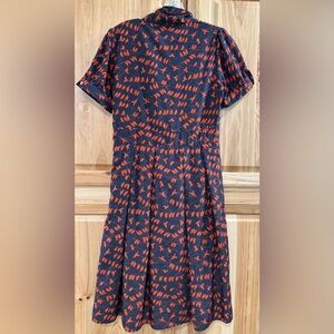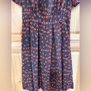 Stylish retro Pink Martini navy dress with striking red/orange bird design throughout. Vintage 50’s vibes. Tie neck. Ideal for versatile styling, festival, event, party. Excellent condition.
