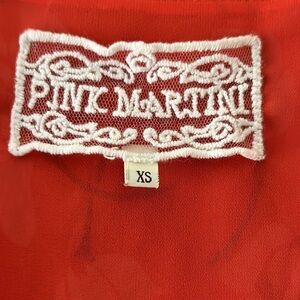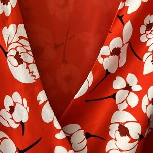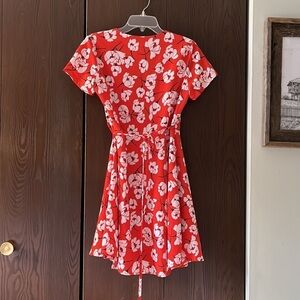 Pink Martini red with white flowers wrap around dress. V neck and short sleeves. Size XS