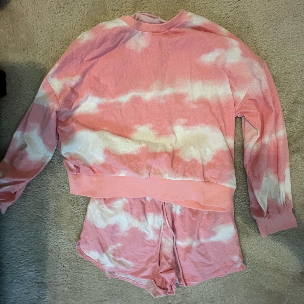 This pink and white matching set is from Impeccable Pig and is super cute for pajamas, lunging around, or a casual travel day! It is long sleeve, but pretty thin material. The top and bottoms are both size medium.