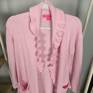 Beautiful barbie pink ruffle robe made of 100% polyester! More light weight so won’t get overheated. Only worn a few times. Selling because the sleeves are too short on me.
