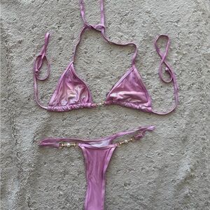 Shine at the beach with this stunning pink metallic bikini set. Perfect for making a statement. XS fits like a S