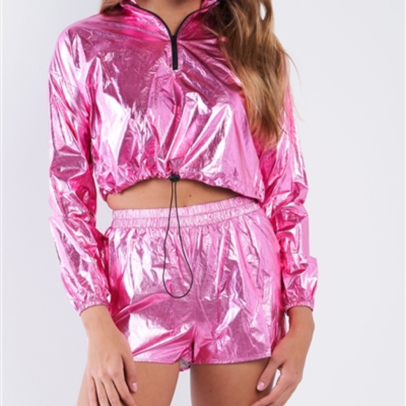 Pink Metallic Drawstring Crop/Short Set
