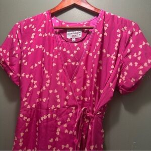 This vibrant pink midi sundress is perfect for casual and work settings, featuring a classic crew neck and short sleeves. The dress combines a fitted bodice with a striking color, offering a blend of modern style and timeless elegance. Its knee-length design makes it a versatile choice for various occasions.