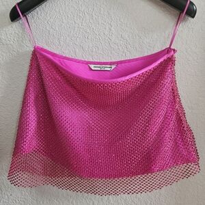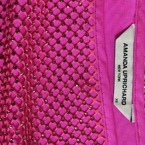 Amanda Uprichard X Revolve 'Niecy' Pink Polyester Mesh Sparkle Mini Skirt Size XS: fully lined, hidden side zipper closure, open knit fabric overlay with rhinestone embellishments throughout.